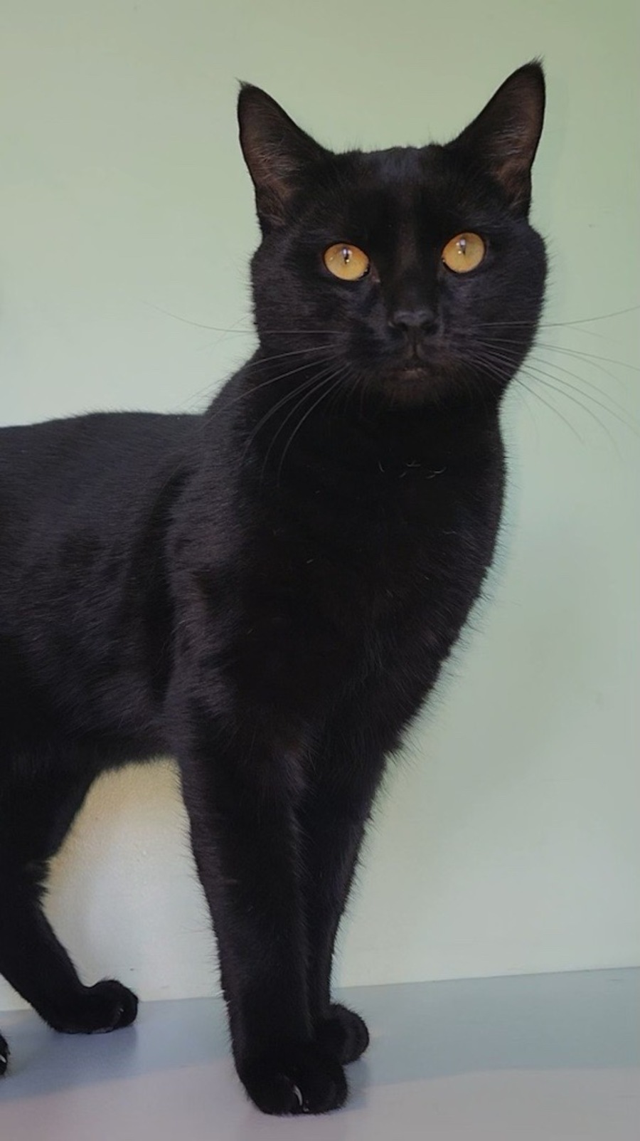 Meet Dexter, a stunning black cat with mesmerizing golden eyes that seem to hold the mysteries of the world. Dexter is a friendly and social feline who thrives on companionship and adores being part of the action.