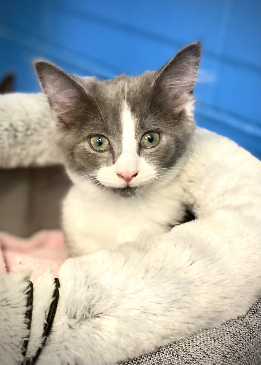 This little man's name is River and he arrived with his 2 brothers at our shelter as a surrender. He is a little shy at the moment, however give him a few days to settle in and he'll be good to go. River has a beautiful purr when he meets you and his beautiful thick grey and white coat is perfect for gentle pats.
