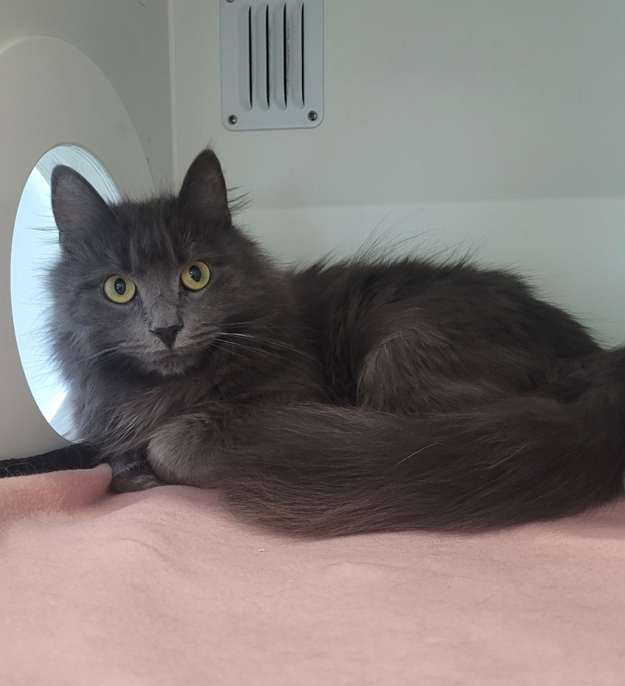 Zena is a gentle soul with a soft, smoky grey coat that matches her quiet nature. While she can be a bit shy at first, once she warms up, Zena reveals her friendly, affectionate side. She enjoys quiet companionship, curling up on her human's lap, gentle chin scratches and playing with her toys.