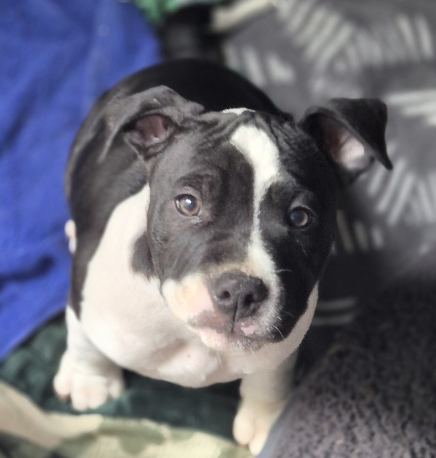 Introducing Colin McLaren, an adorable English Staffy puppy with the heart of an old soul in a playful young body! With his unique markings that make him look like a miniature cow, Colin is as charming as they come.