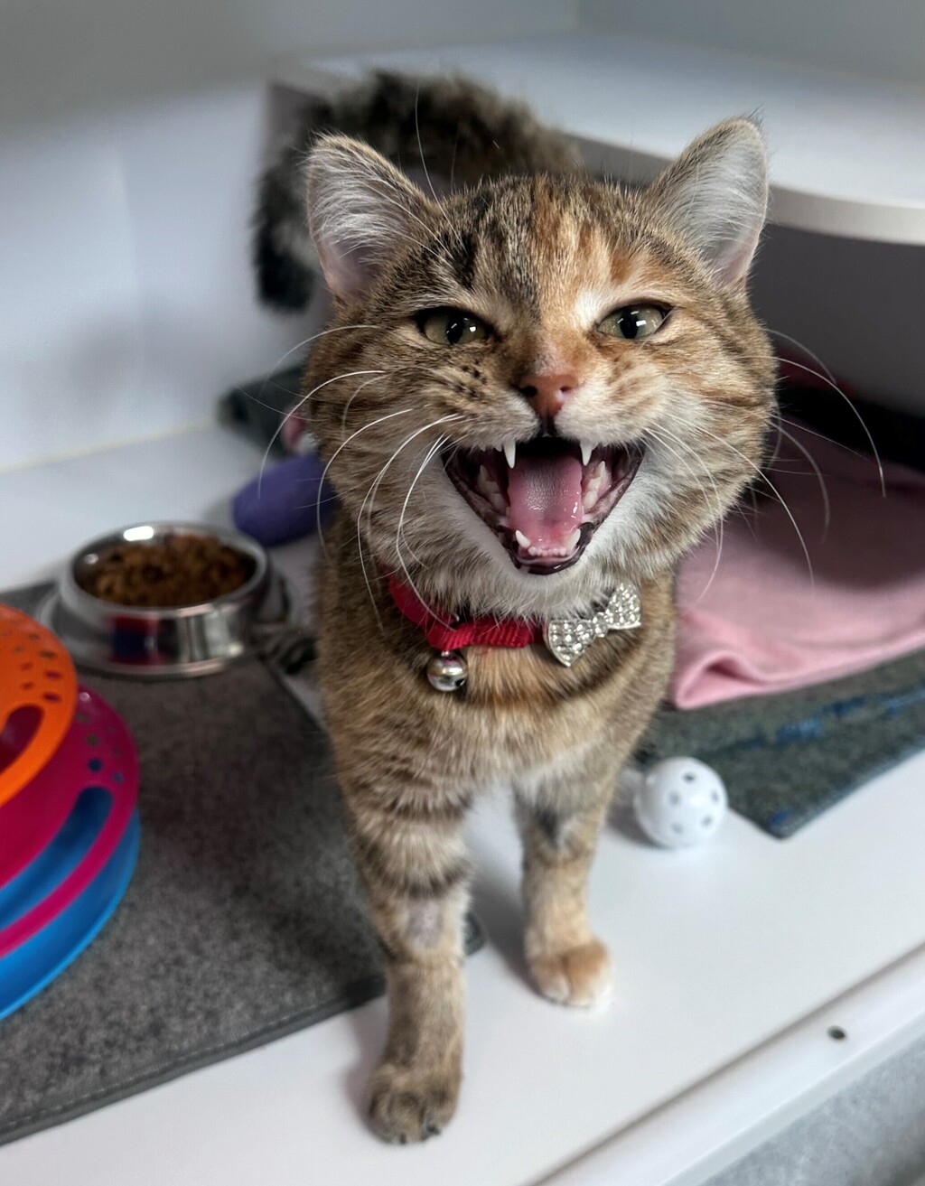 Amber is a sweet cat she has high enrichment and training needs and potentially may need some management around door ways. She will need a family that are understanding and are excited to provide her mental and physical stimulation. She will benefit from training calm behaviours such as target training and mat training. Setting up puzzle feeders and lick mats - using her special diet.