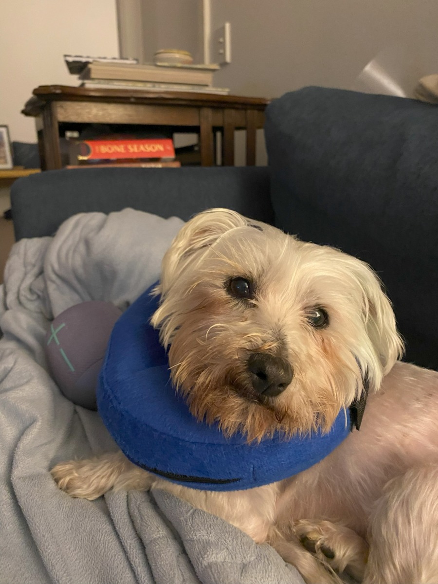 Luckily, she is a perfect social companion and can go anywhere. She is happy to settle in the car on a comfy bed for drives and wants to make friends with both dogs and humans. She has not reacted to any cats so far but is not curious about them at all. She would enjoy a home with children over 10 as she is a little wobbly on her back legs and can get knocked over easily