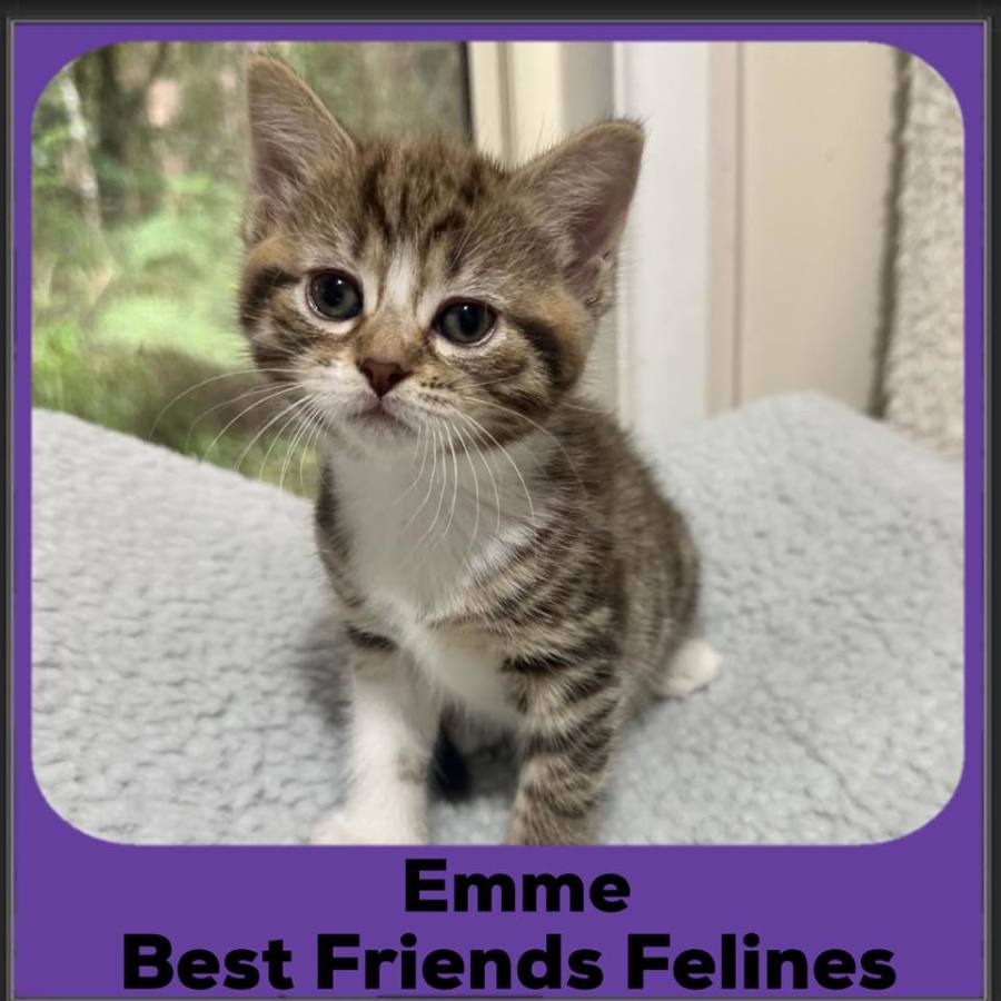 Meet Emme, a beautiful tabby kitten with adorable white paws and a white chest that makes her even more irresistible! Emme is the ultimate cuddle buddy—super friendly and always up for a snuggle after a fun play session. She loves playing with toys and her siblings, but she’s also the most laid-back of the litter. You’ll often find her curled up, fast asleep, after a big play, or relaxing and enjoying a good pat. If you’re looking for a sweet, playful kitten with a calm and loving nature, Emme is ready to bring all the cuddles and joy into your home! To arrange a meet to see if this could be your perfect match, please submit our meet’n’greet form - http://www.bestfriendsfelines.com/forms/meetngreet-form/
