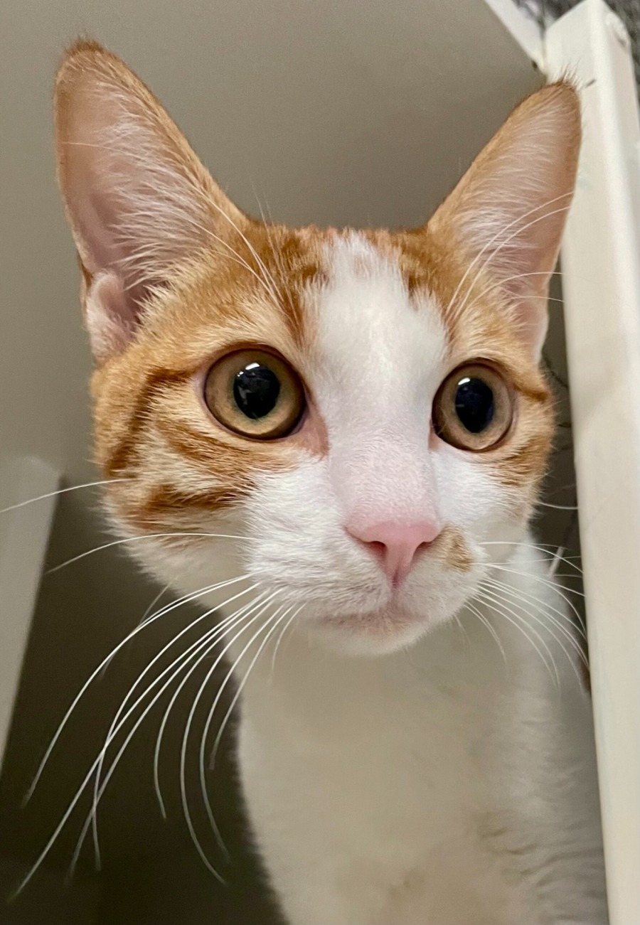 Flaco is a handsome 10-month-old ginger and white kitten who’s ready to find his forever home! Found on a construction site with his sister Jitterbug, Flaco is affectionate, cuddly, and loves curling up in a cozy lap. He’s not bonded with his sister, but they would make a lovely pair if you’re considering adopting two cats. While he doesn’t mind being picked up, Flaco may take a couple of weeks to fully settle into a new environment, but once he does, he’s an absolute sweetheart.