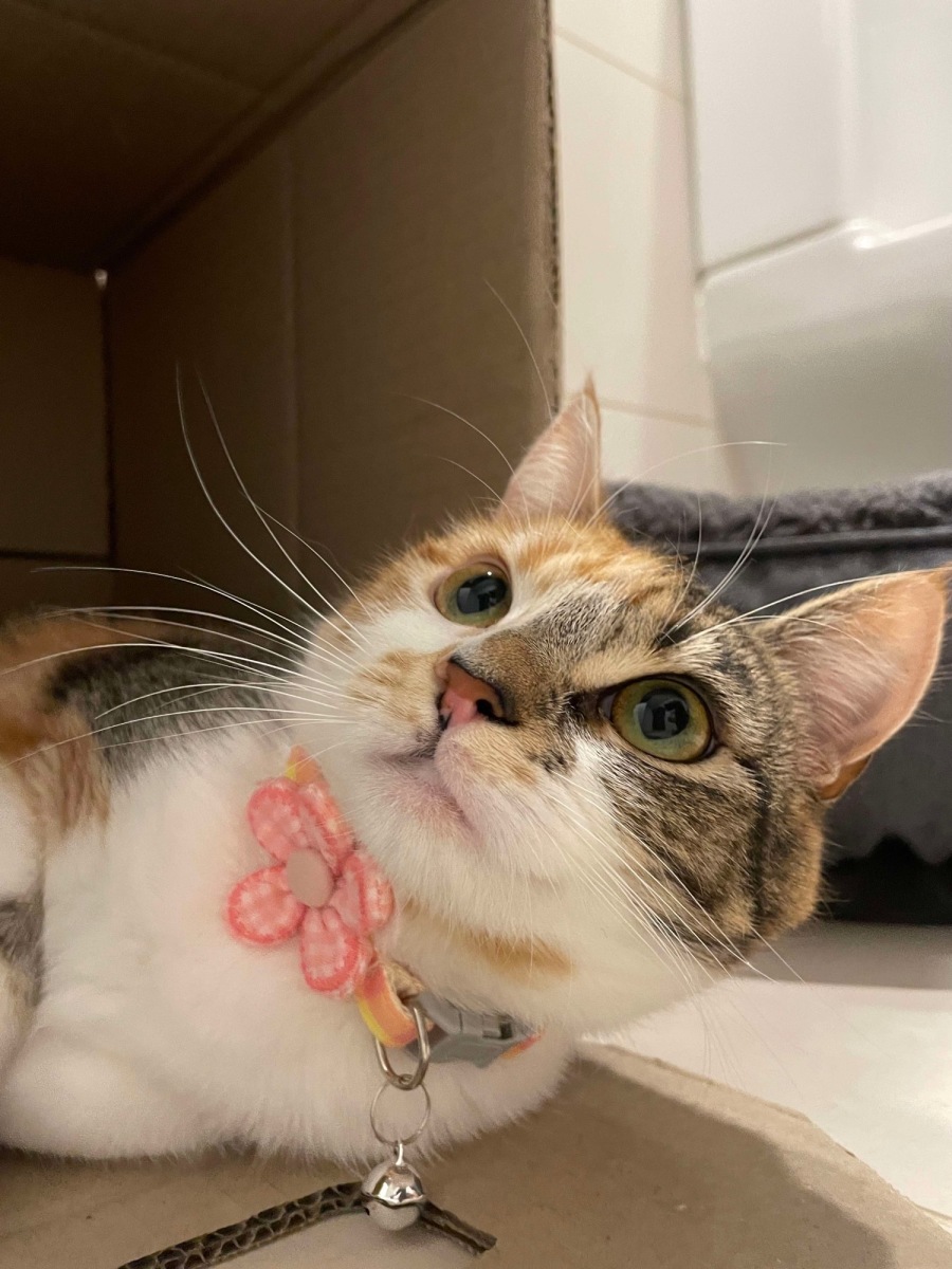 Tabitha loves rubbing herself up against you and giving you head rubs. Her current favourite person is her foster mum (probably because she feeds me, says Tabitha). She likes following her foster mum around and sitting next to her while she works from home. She also loves playing with her toys and can often be found playing on her own.