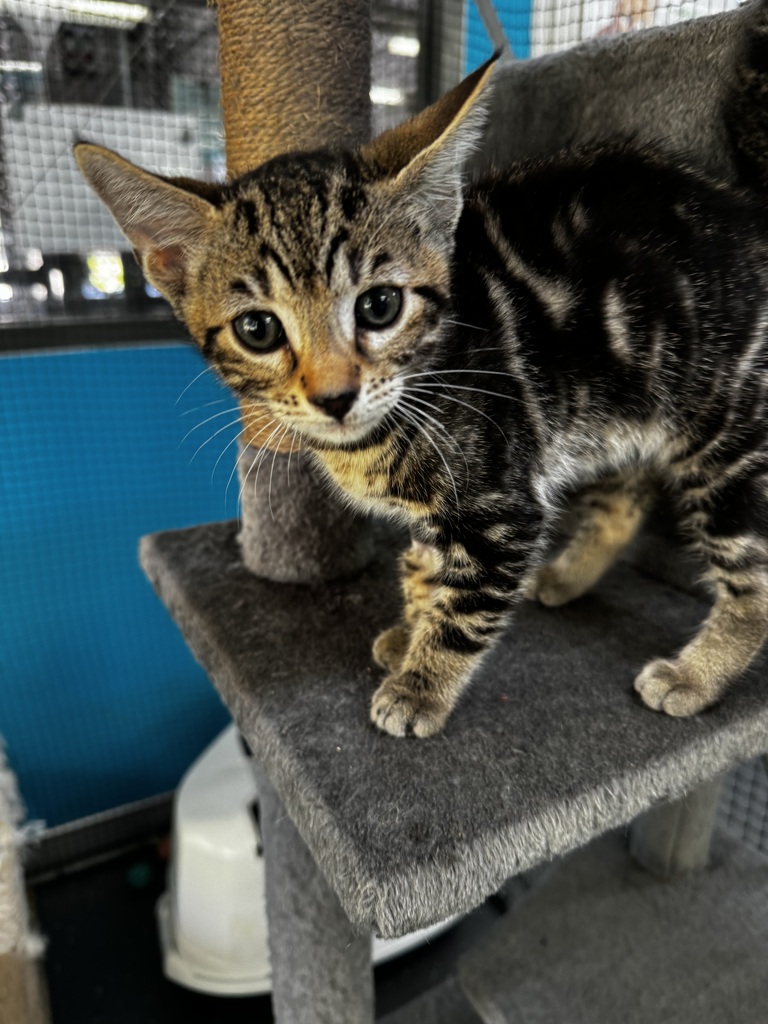 Born in foster I have only known a great mother cat and loving carers, so I am a sweet, sociable kitten. When you walk in a room, I will run up to see you. I like lying on your feet, often wrapping my paws around your ankle and playing with your toes, then going to sleep. I also lie on my back waiting for a tummy rub and show off my spotted tummy. If you want an affectionate kitten, I am the one for you!