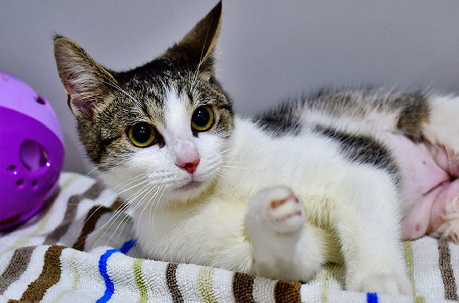 Staff Comments: Zippy is an active girl, a bouncy kitten. She will play with her water bowl is she is feeling a lil bored... She's a sweet girl who loves attention & will happily roll around in front of you to show you how content your presence makes her feel...