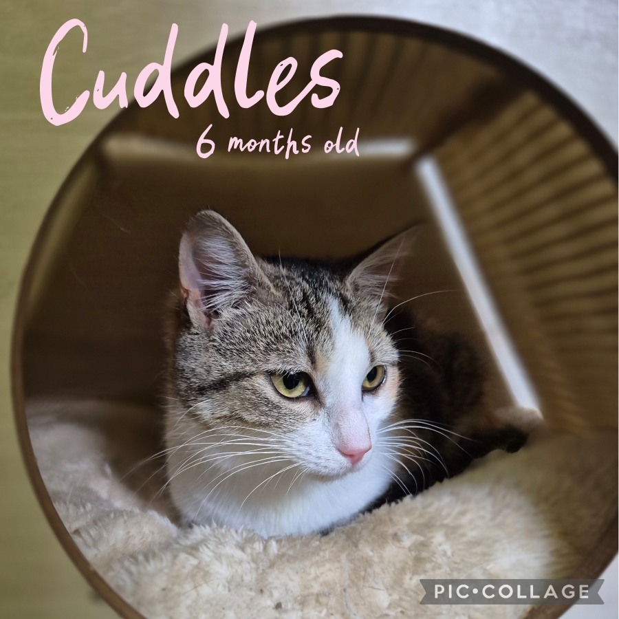 Meet Cuddles, a delightful and affectionate feline who is true to her name! This charming girl has a gentle, calm demeanor that makes her an ideal companion for those who enjoy serenity and quiet companionship. Her loving nature is evident every time she rubs against your legs, purrs contentedly, or curls up beside you for a cozy snuggle session.