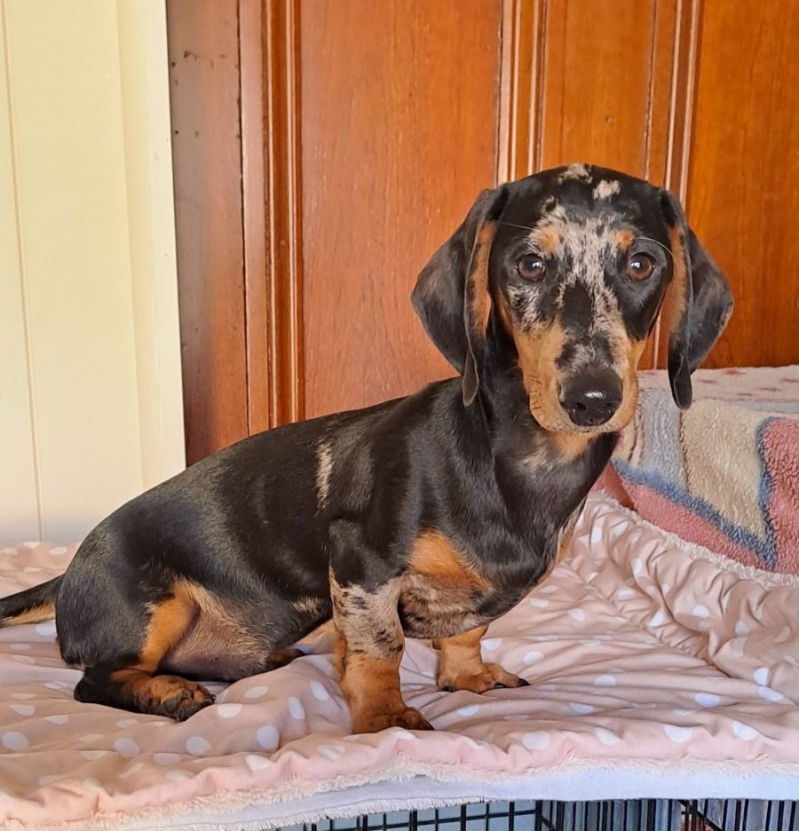 Please meet Ricky, a charming short-haired miniature Dachshund with a super shiny reverse dapple coat. He was born on 27 April 2024.