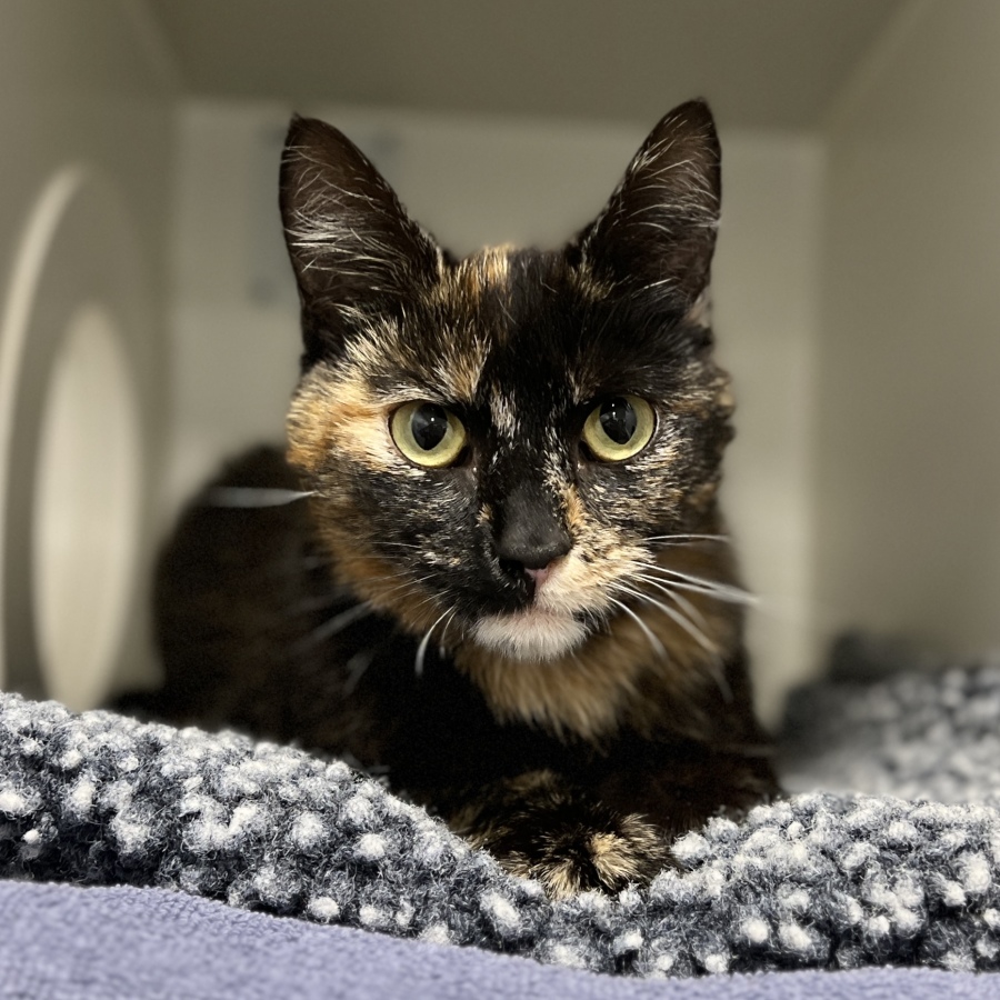 Minkee is a stunning dark torti kitty with a heart as warm as her beautiful coat. She may start off a little shy, but once she gets to know you, her sweet personality truly shines. Minkee adores gentle affection and will nudge you with the cutest headbutts when she’s ready for more pats. She’s known to flop onto her side when she's feeling especially content, a sure sign that she’s loving the attention!