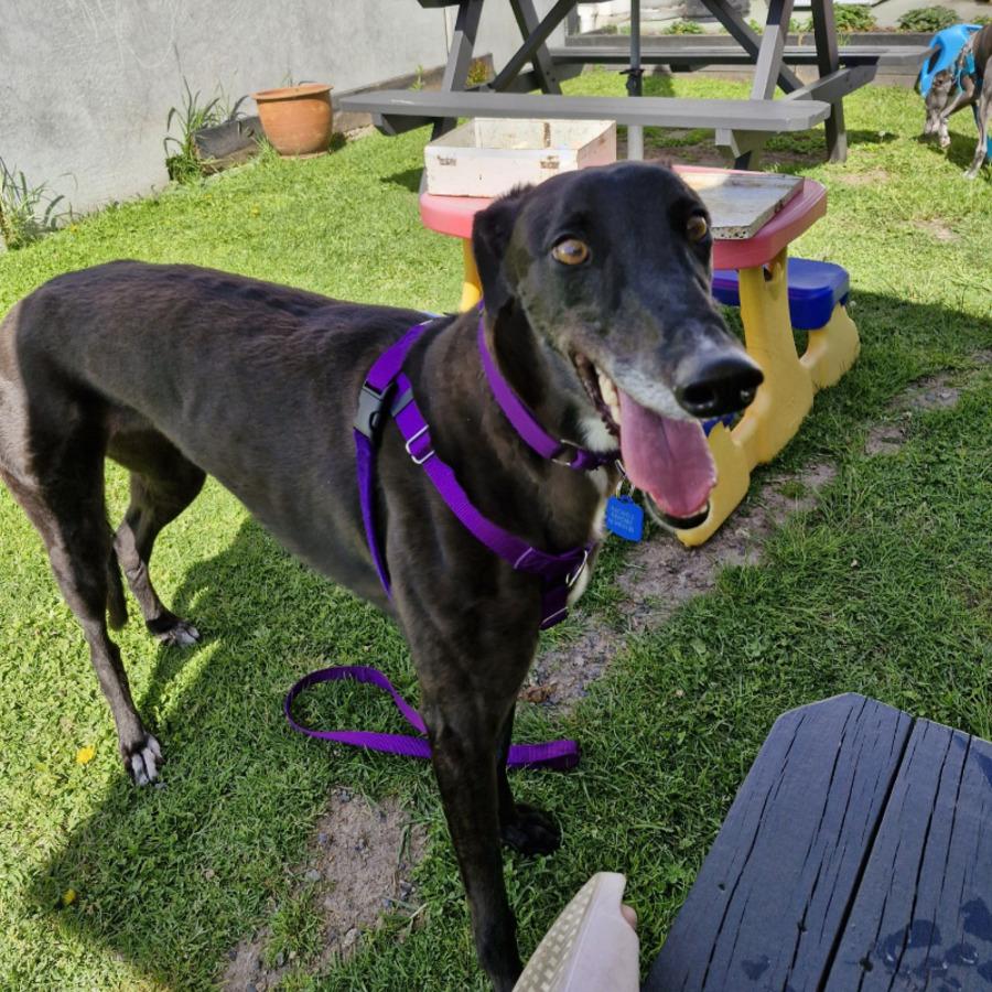 She has had a toe removed due to an old racing injury while in foster care and has been a dream patient during her recovery. She has been incredibly tolerant of all aspects of her aftercare, confirming her gentle and trusting nature. She is beginning to become more playful, collecting soft toys that have squeakers is her favourite game. But for Bunny, nothing is better that snuggling on the couch with her humans. Due to her toe, walks have been short and we have seen very little running and zoomies, although we are seeing hints she would like to play more actively with her foster brother. Despite being kept quiet, she hasn't been bothered by this, happy to just potter around and nap. However, Bunny is a young dog and we believe that as she continues to heal she will become more able to go on longer walks, adjusting to the physical preferences of her forever family.