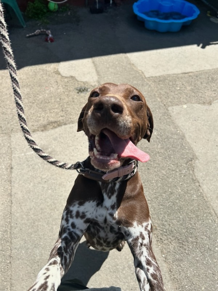 Despite being an "old girl," Daisy still exhibits the joyful energy and curiosity that make German Shorthaired Pointers famous. Daisy gets along famously with other dogs, thriving in an environment where she can have canine company by her side. Her true joy comes in gentle play, relaxing on the couch, or basking in the sun with her beloved humans nearby.