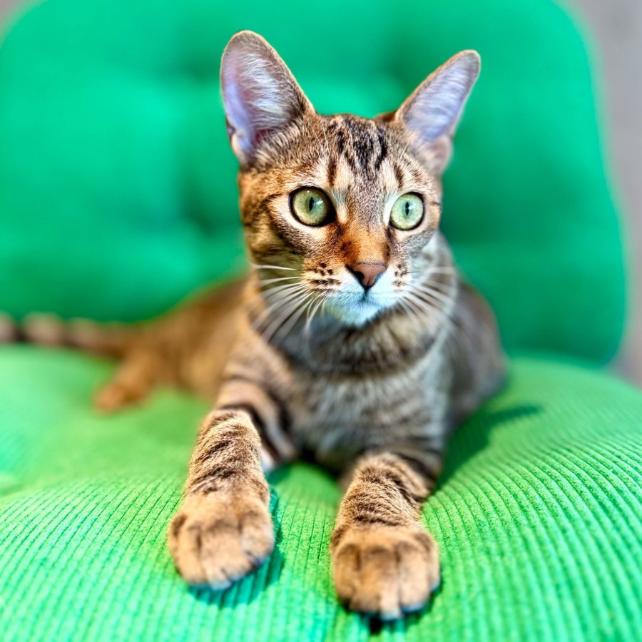 I love meeting new people and treating them all as my best pal. At other times, my favourite thing is climbing up high on my cat tree and batting the hanging toys on it or just watching the world go by.