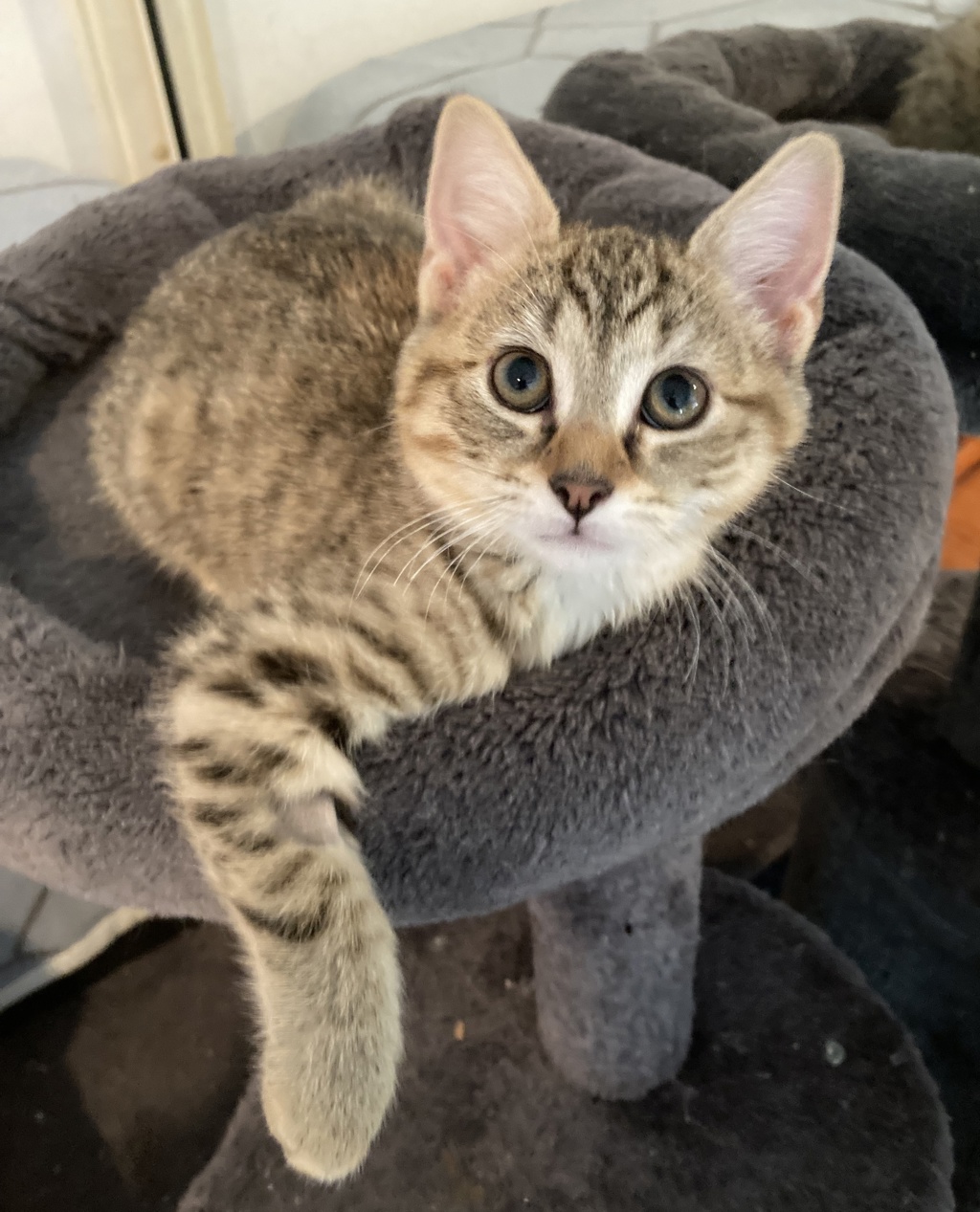 Introducing Cookie. Cookie is a super tabby with super tabby powers. Cookie will have you eating out of her paw within seconds of meeting her. Cookie is always up for a play session with her litter mates and then curls up for a kitten nap. Cookie is lovely and is looking for that special home where she will be forever loved and cherished. Cookie's carer describes Cookie as a purring machine with an affectionate nature. Cookie is friendly with other cats and also has experience sharing her foster home with a medium sized dog. Cookie is in foster care in western Sydney and is available now for adoption. Please apply on line via the AWL NSW web site.