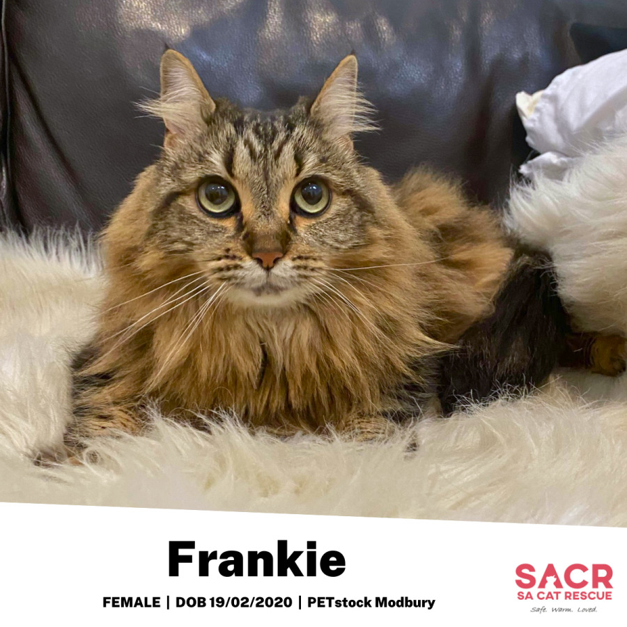 Meet the stunning Miss Frankie, a bundle of fluff with a heart full of love. At first, she may come across as the quiet type, but Frankie warms up almost instantly, revealing a gentle and affectionate nature. Her delicate balance of independence and love ensures she remains a constant source of comfort without ever being overwhelming. You'll find her politely awaiting your call to come over for belly rubs and cuddles, a true testament to her affectionate nature.