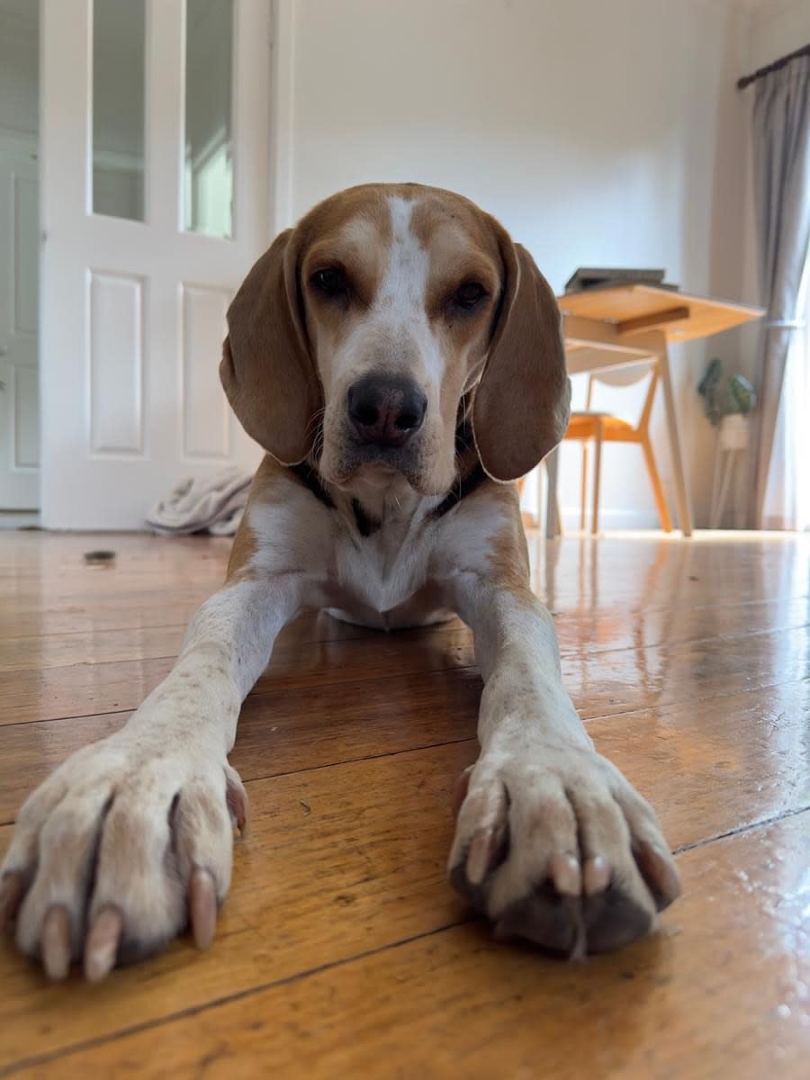 He’s well-trained in the basics like sit and stay, though being a classic hound he is known to bend the rules if there’s an opportunity to get an extra snack. Frank is patient and will patiently wait at the door to be let in or out for toilet breaks etc.