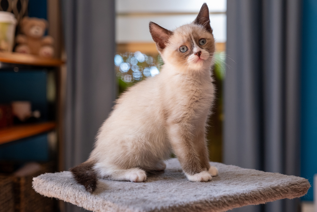 Cinammon loves attention from, and playing with, her human companions, including the children. She can't wait to greet her carers every morning, running up to them to say hello with loving little nudges and affectionate headbutts when the they enter the room. When Cinammon is not playing, exploring, or soaking up affection, she loves to take little naps in her cat tower.
