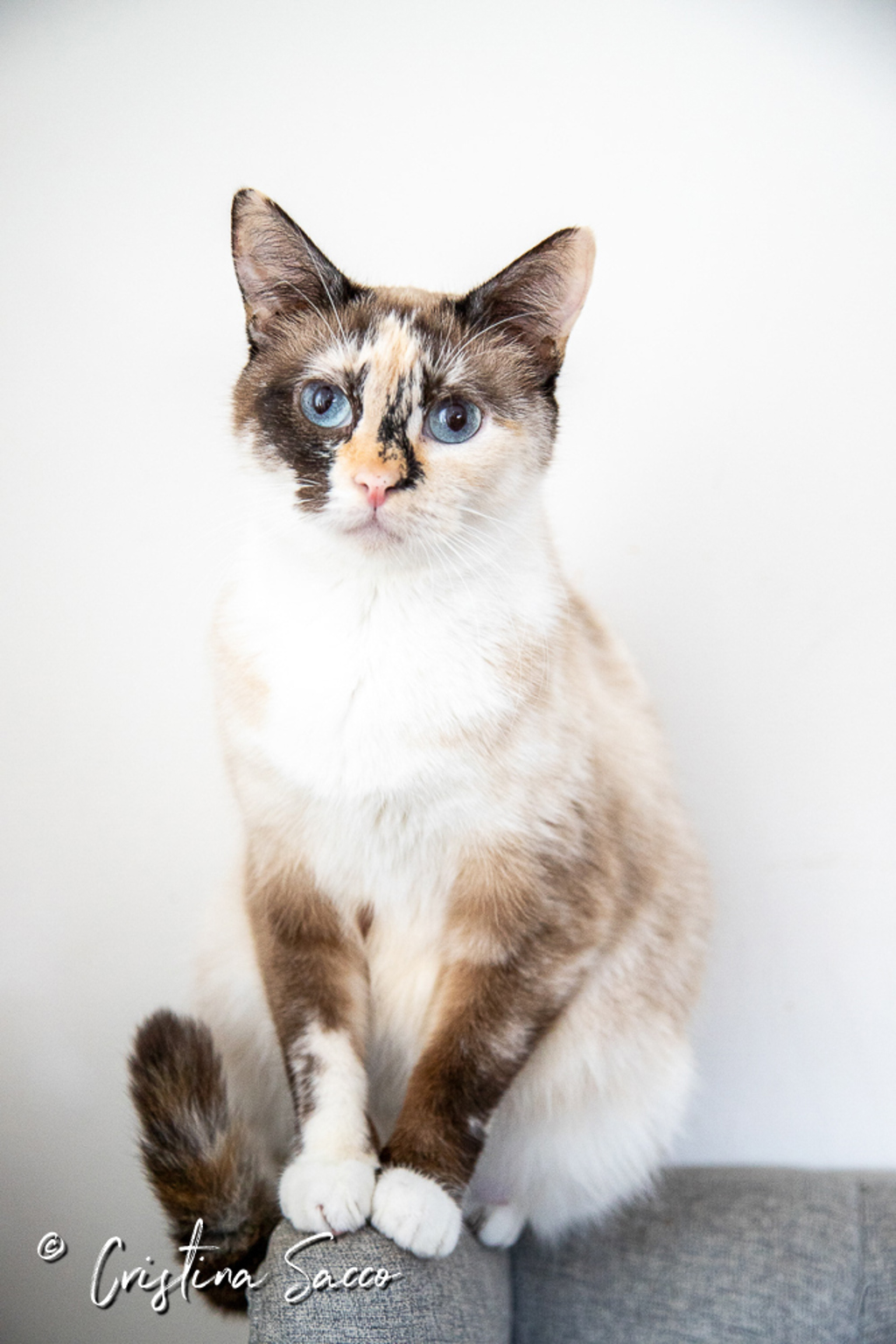 One of the most striking cats we have been fortunate to care for, Alice has everlasting beautiful opal blue eyes, set against a gorgeous multicoloured coat of white, with dark brown streaks on her face and legs with perfect white socks.