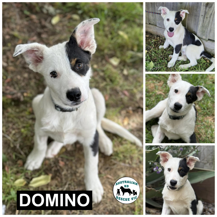 Meet Domino, an adorable and sweet little guy who has an immense love for his human companions. As a border collie x , Domino is naturally a bundle of energy, always full of beans and excitement. His intelligence shines through as he eagerly embraces the opportunity to learn new things, especially when it comes to mastering basic skills. Domino finds joy in spending time with the older dogs in his household, and he particularly looks forward to dinner time. During meals, he is currently hand-fed, which is part of his training to learn basic obedience commands.