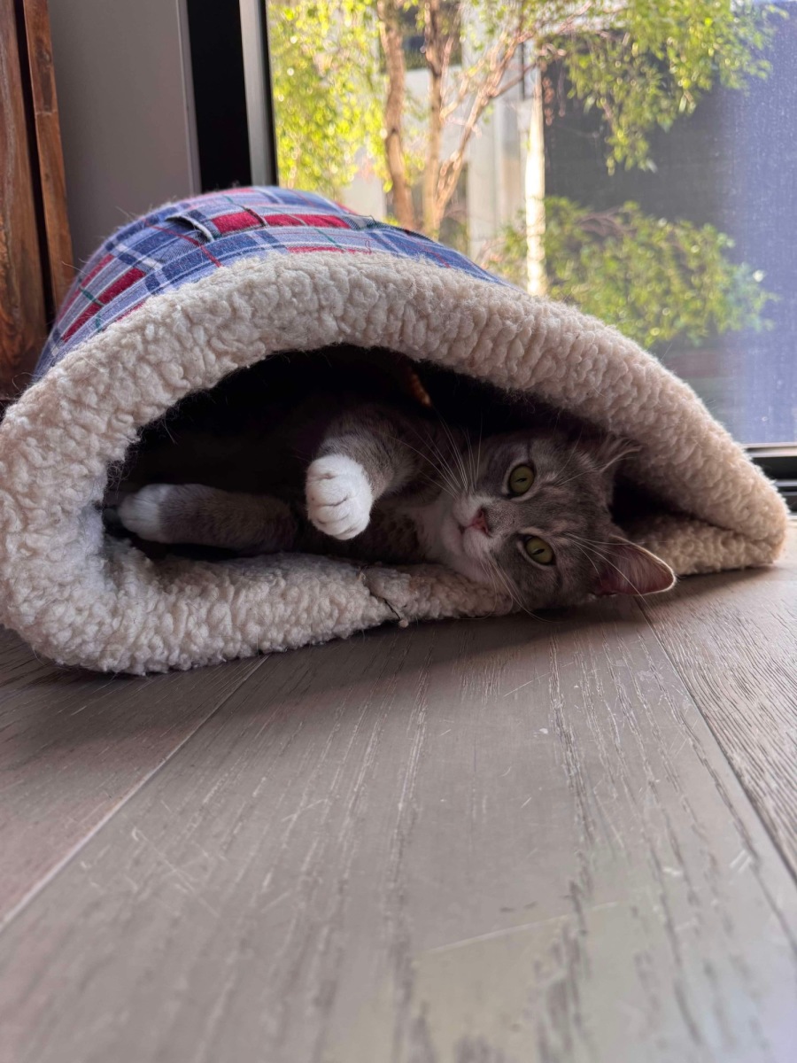 He’s a gorgeous silver tabby with adorable white paws. He is beautiful inside and out!!
