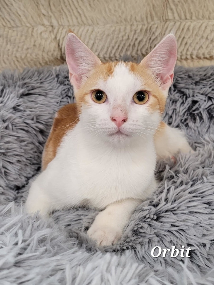 Orbit is a purr machine who will climb into your lap and onto your shoulder to be close. A very athletic kitten who loves play and wrestling.