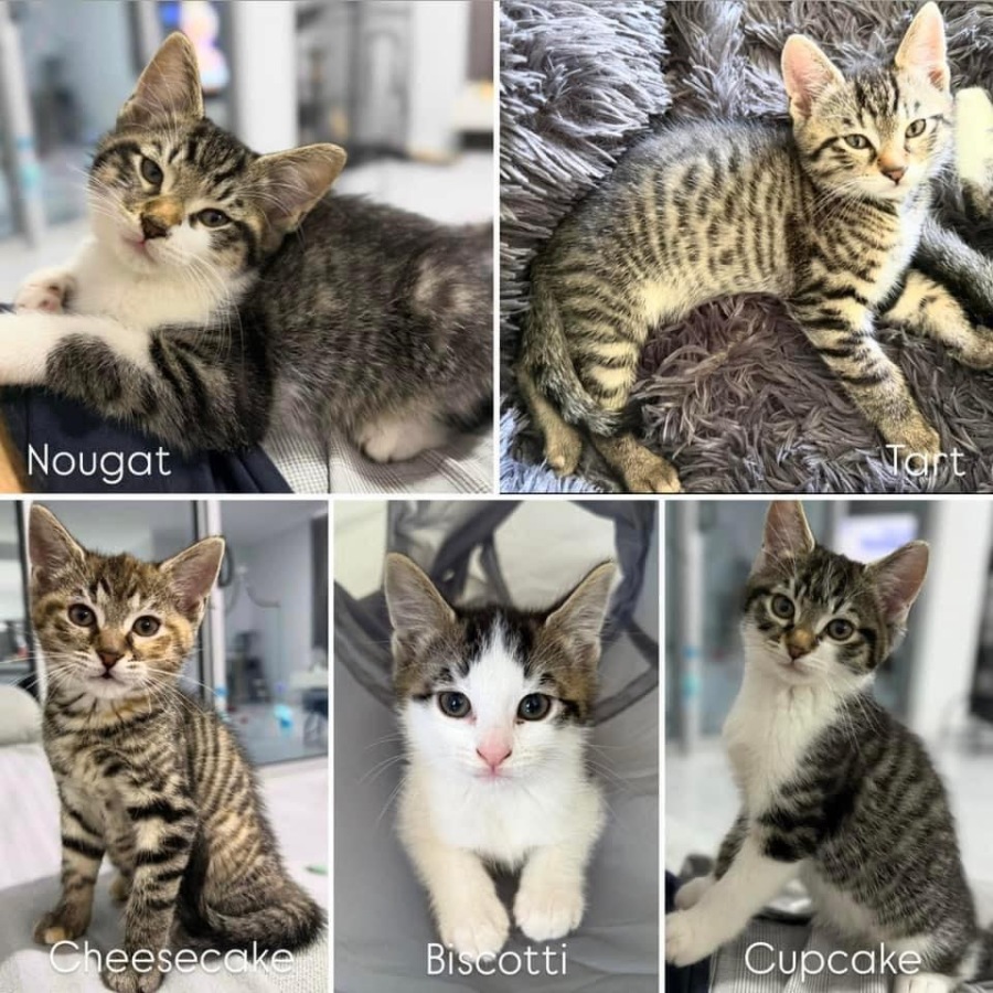 Meet the Dessert Dream Team! Tart, Cheesecake, Biscotti, Nougat, and Cupcake are the sweetest, most affectionate and easygoing siblings youâll ever meet. With their loud purrs and loving personalities, theyâre all about spreading the happiness and love.