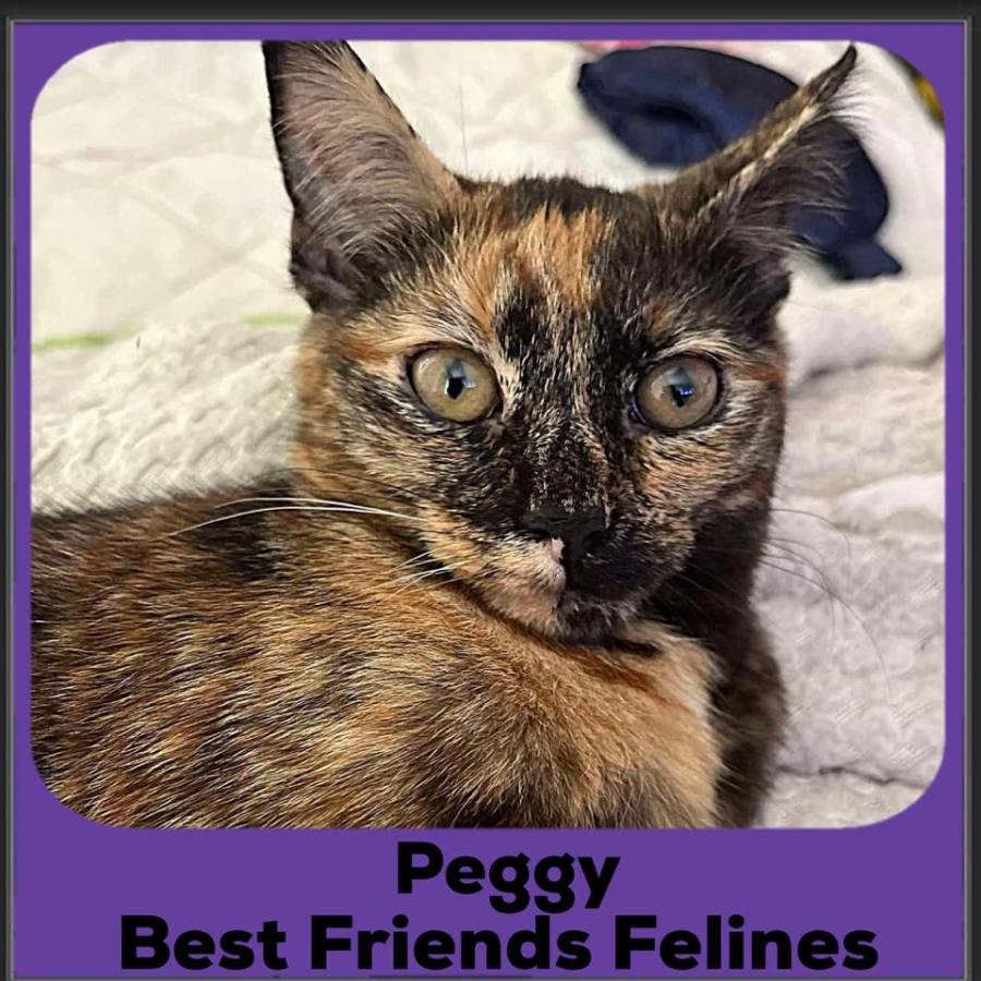 Peggy came into care after being surrendered with her mum at the pound. She was pretty unsocialised when she arrived but has come a long way since. Still a little shy Peggy is yet to embrace her full tortitude but loves sitting next to you for pats. She enjoys playing with the cats at her foster home and with proper introductions would do well in a multicat household. She enjoys playing with toys and shows this with great big purrs. Peggy is absolutely gorgeous so are you her future human? If you would like to meet this little one, please click on the link and complete the application form. http://www.bestfriendsfelines.com/forms/meetngreet-form/