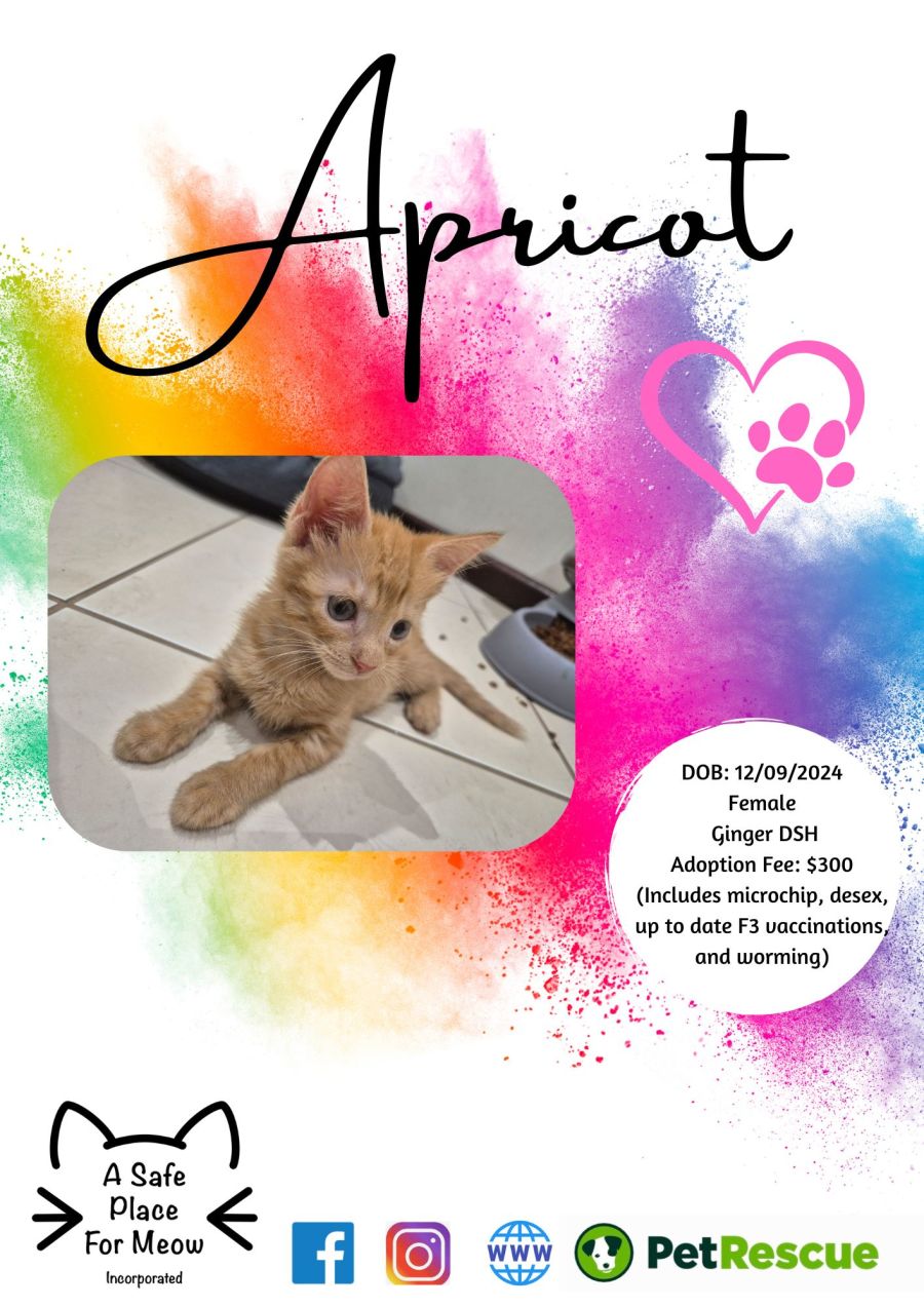 Her affectionate ways are sure to bring warmth and joy to your heart. Apricot's companionship is unmatched in her ability to turn every moment into a cherished one. With her curious and adventurous soul, she'll keep you entertained with hilarious antics and snuggles.