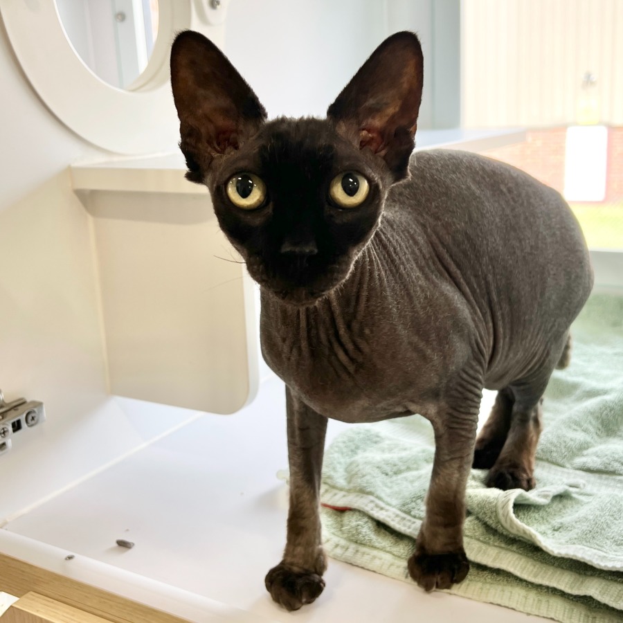 Jaguar is a 4-year-old Devon Rex cross who is looking for a forever home where he can share his love, quirks, and cuddles with you. His distinctive, hairless appearance only adds to his charm! With a soft, smooth, almost velvet-like feel to his skin, Jaguar will quickly win you over with his affectionate nature and playful spirit.