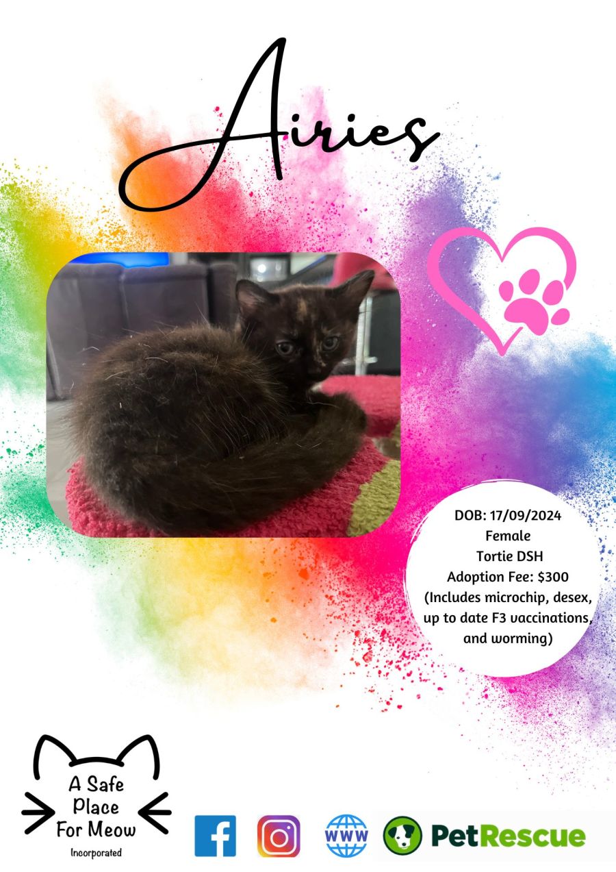 Meet Airies, a charming, soft-natured tortoiseshell with a flair for fun and a heart full of warmth. Her beautiful, fuzzy fur and unique facial markings make her truly one of a kind, ensuring she stands out in a crowd. As one of four siblings, Airies is no stranger to playful antics, but she definitely has a personality all her own.