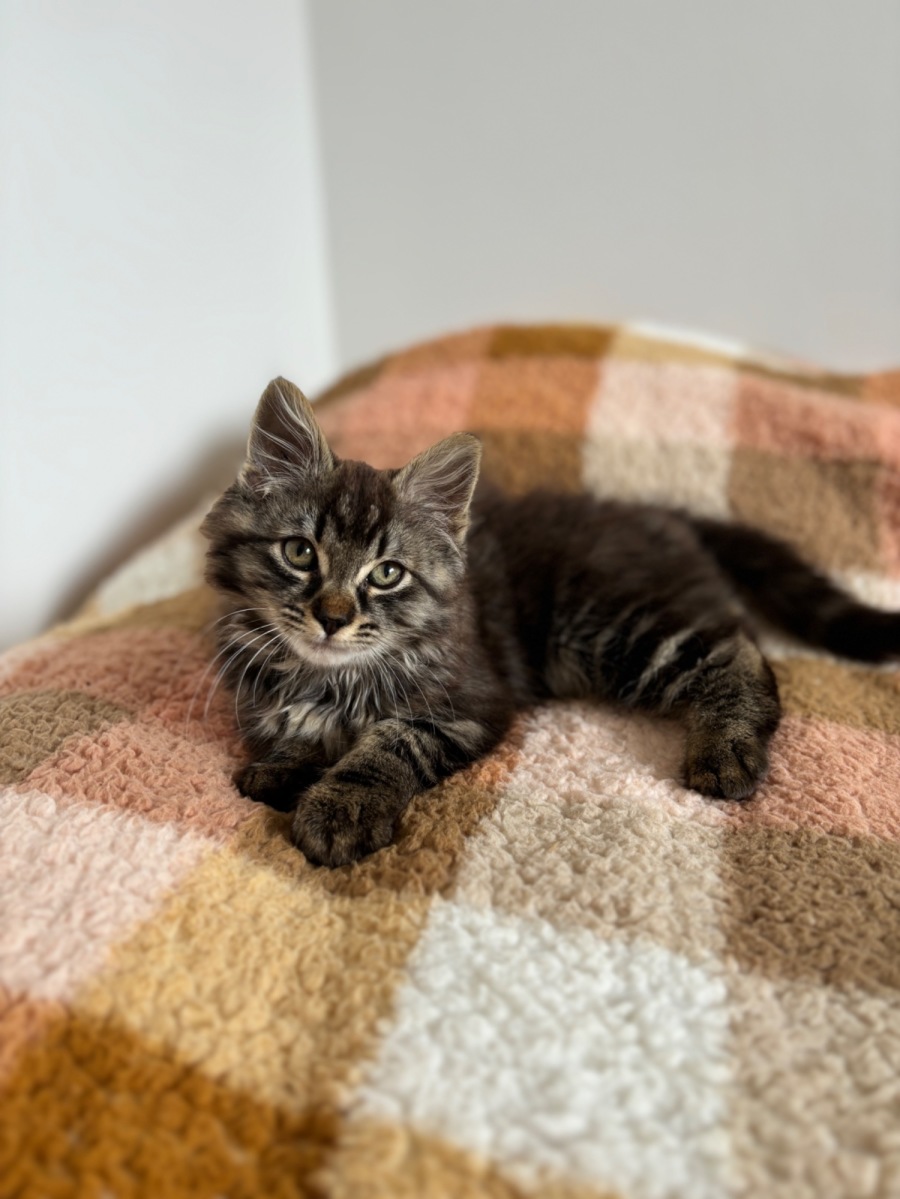 Meet Peaches, a delightful 9-week-old chocolate tabby kitten who instantly wins hearts with her sweet and gentle nature. With her soft, medium-length fur and beguiling eyes, this petite feline is the epitome of cuteness. Initially a bit shy, Peaches might take a little time to warm up, but once she does, you’ll discover just how affectionate and playful she can be.