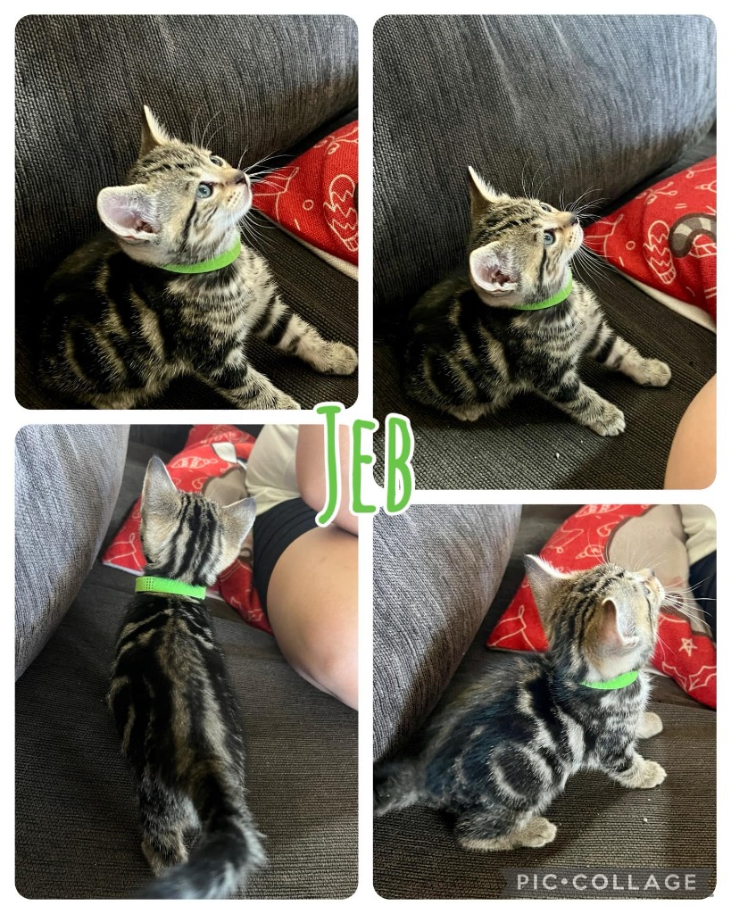 He’s not a fan of sleeping alone, so if you’re looking for a kitten who’ll love to curl up with you (or his siblings) at the end of the day, Jeb is your guy. His affectionate nature and playful spirit make him a wonderful companion who’ll keep you entertained and loved.
