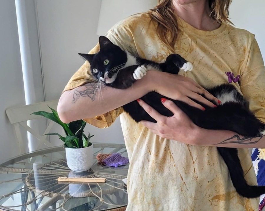 Meet Stevie Mitts, the feline cuddle queen! She is a loving cat with a penchant for affection that's hard to resist. Stevie Mitts absolutely adores getting scritches and cuddles, and she’s not subtle about letting you know it’s time for attention. Her unique way of expressing herself is charming and engaging, as she’ll chirp playfully to remind you that the petting session is far from over.