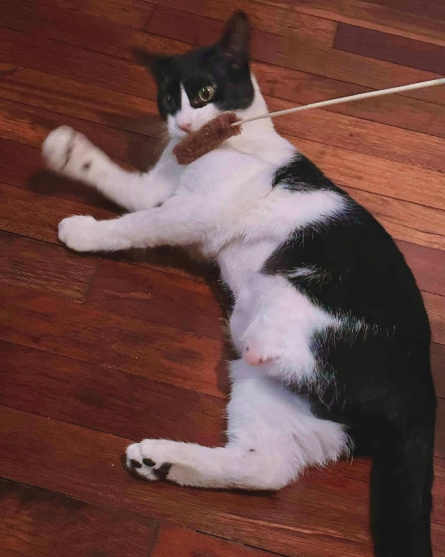 I love everything, from food to pats to playing. My favourite thing is to stretch out in a lap for pats and biscuit-making. My purrs need to be heard to be believed.