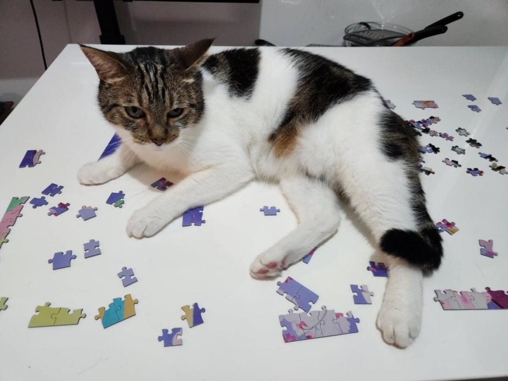 Yogi's foster carer describes him: "He's very sweet, 10/10 lap hog, will come up and lie across you either when you're sitting down on the couch watching TV or when you're in bed and demands pats. When I pick him up he licks my nose, he very affectionate. He did bite me once, but to be fair, I was trying to push him off my puzzle. He is not agreeable to being removed from a jigsaw puzzle. In an ideal world, he should be a single child. He could live with another cat depending, and he would need a lot of attention and love. He needs a lot of love anyway."