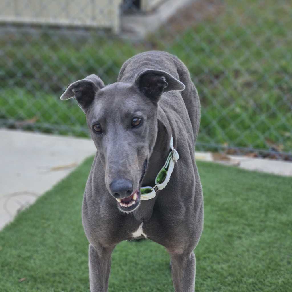 I’m a beautiful blue hound, which is probably why they call me Smurf, even though I can’t whistle and I don’t have a little white hat with matching pants, haha! I’m a happy, bouncy guy who LOVES meeting new people. I love meeting other hounds too, but I’m still learning my manners. I just get SO excited, you know? I’m like Clumsy Smurf after he crosses a room without landing on his face- joyful, exuberant and a little socially awkward. But my human friends help redirect me if I go all over-eager and OTT and I’m happy for that. I’m not great around smaller dogs yet and I get a bit protective of my stuff, so I’m probably best suited to a single houndy home. My friends at Greyhound Rescue are also still testing out whether kids are well suited to me, so watch this space for more information.
