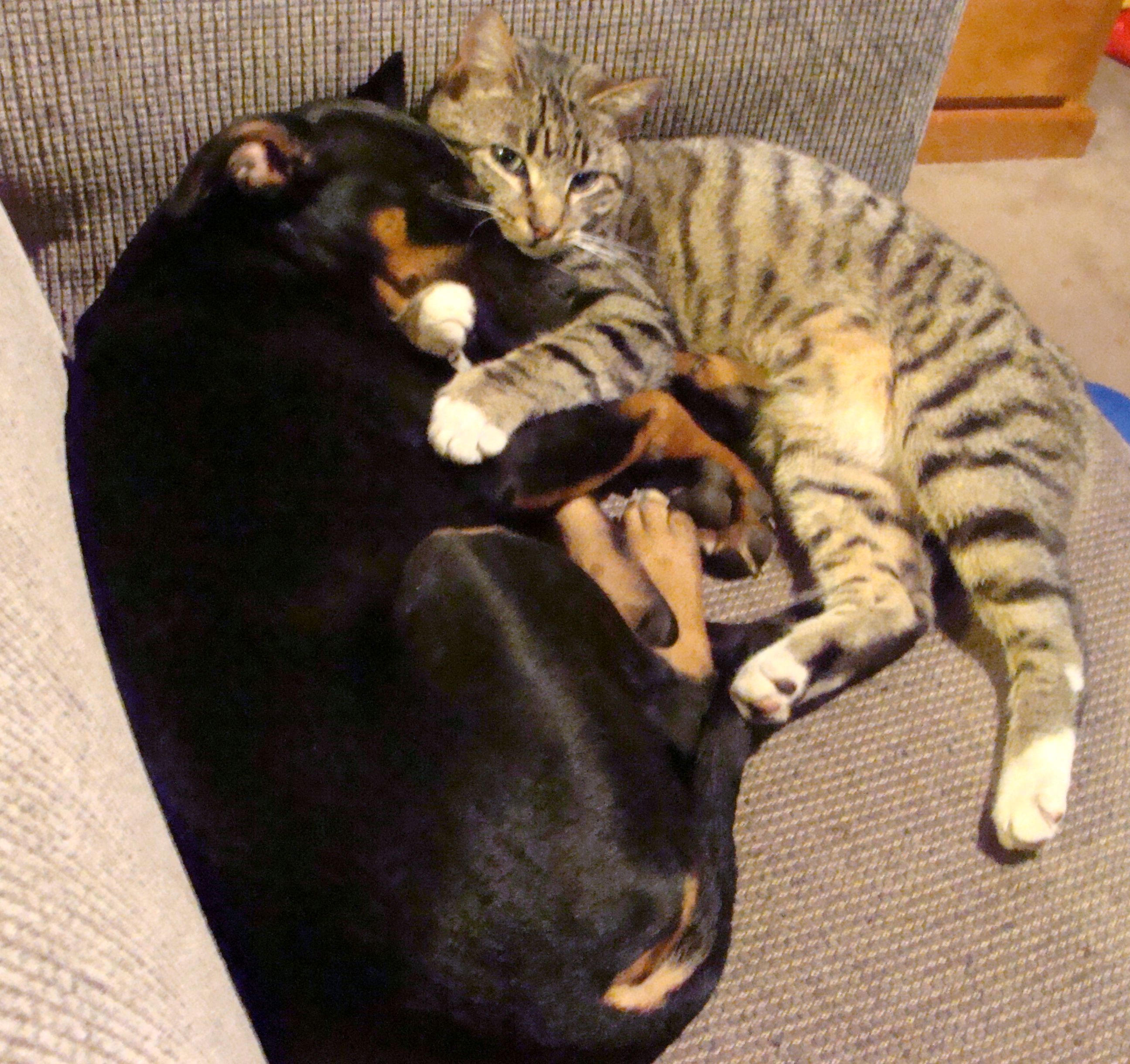 Chester is playful, attractive and sweet natured. He has been badly treated and is slowly learning to trust people. He will purr and snuggle when picked up. He is a striking cat, (hard to catch in a photo!), with beautiful colouration. Chester is clean and is currently living with a baby, two dogs and another cat. He will make a great companion. The pup in this picture is also looking for a home