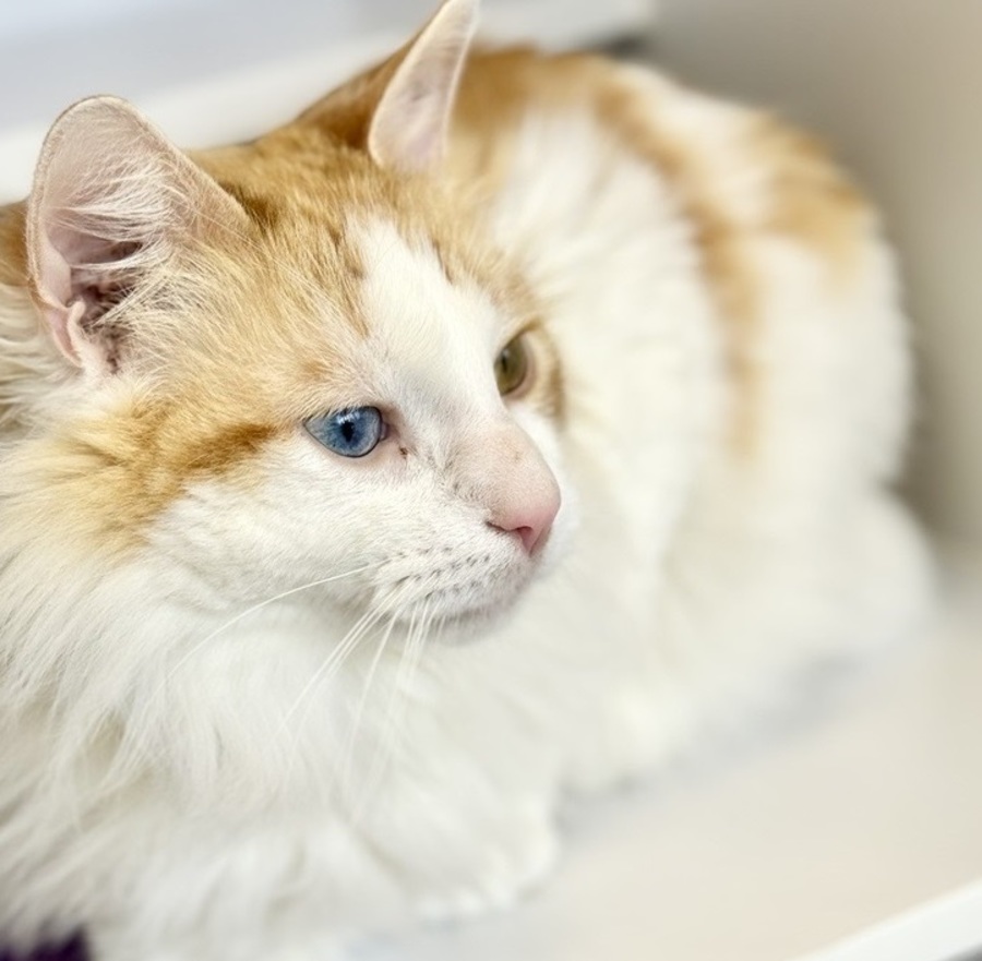 Blaze is a striking kitty with a captivating look—his eyes are heterochromatic, meaning they’re two different colors! This unique feature perfectly complements his big, bold personality. Blaze is a curious explorer with a zest for life, always eager to check out every corner of his surroundings, discover cozy nooks, and scale his favorite climbing spots.