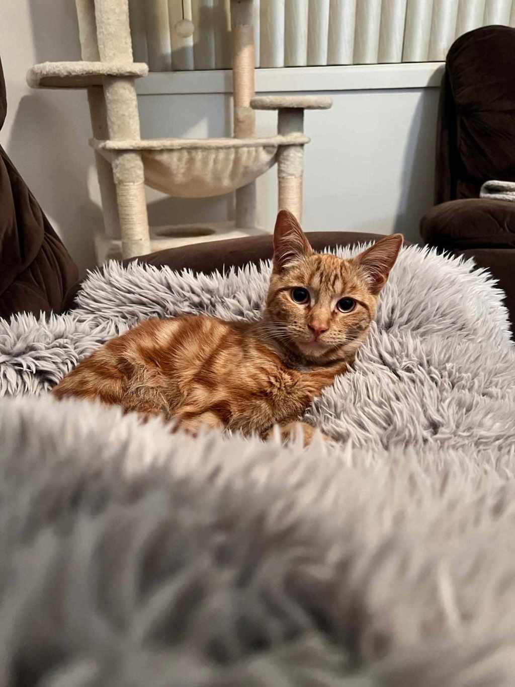 Oranje has a distinctive meow that sets him apart from the crowd, along with adorable, bird-like chirps that bring a smile to everyone who hears him. His vibrant personality shines through every playful leap and pounce, and when he's all tuckered out, he settles down for the happiest naps you've ever seen. He's a social butterfly too, getting along well with other cats who can match his lively energy, and he loves his food-never shy about reminding you when it's mealtime!