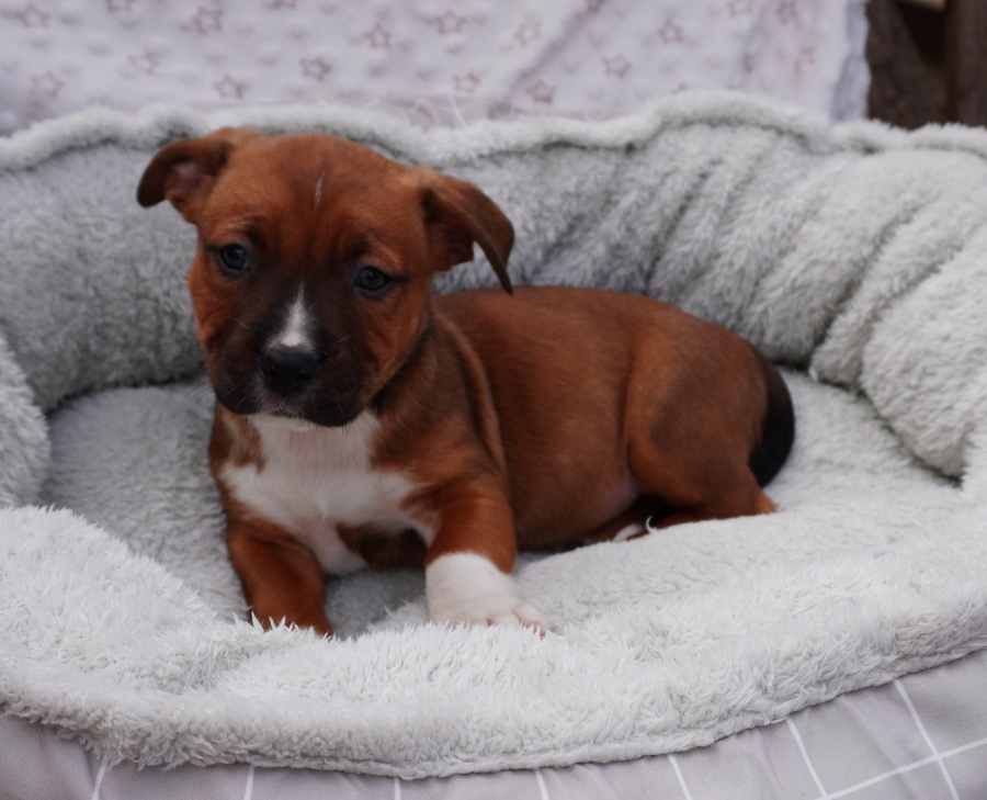 Meet Darcy, an uber-cute 8-week-old Staffy mix boy with a heart as big as the universe! This little guy is bursting with puppy and curiosity, always ready to explore his world or snuggle up for some affection. He is very calm little chap who will be a great addition to a family!