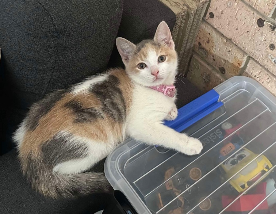 She's a happy-go-lucky little kitten. She loves playing with toys and with her sister and brothers (and any other cats and kittens in her foster home). Like all kittens she loves cardboard boxes and jumping out like a jack in the box to punch on her siblings.