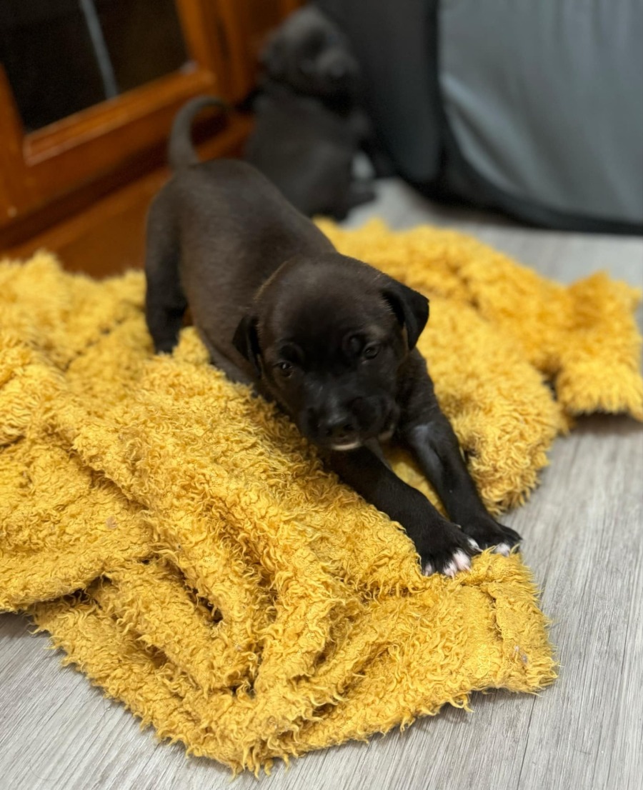 Meet Pocus, an adorable Staffy mix with a sweet and loving personality, ready for pre-adoption! At just 4 weeks old, this little female pup has already developed a fondness for snuggles and companionship. She'll melt your heart with her gentle demeanor and eagerness to be part of everything you do. Raised by hand since she was a week old, Pocus is well-socialized with other pets and children, making her an excellent choice for most families.