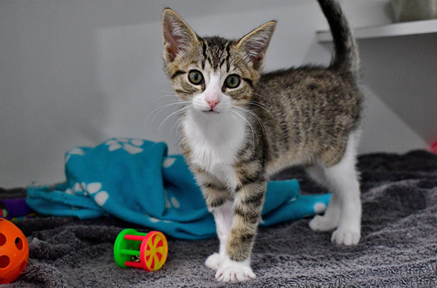Just like all kittens, Schwartz would love a cat tree to climb on and scratch, and an assortment of toys to play with. He should be fed kitten food multiple times a day to ensure that he grow up big and strong.