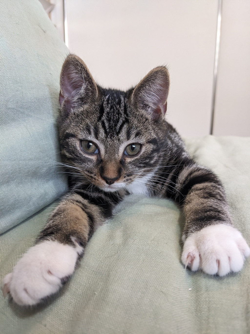 Meet Gravy, a kitten who's as delightful as his name suggests. He's an adorable ball of energy, always ready to explore new corners and chase after toys. He's got a playful spirit that's contagious, making every day an adventure. But Gravy isn't just about fun and games. He's also a cuddly companion, always ready to curl up and purr away the day. His bravery shines through in his curiosity, unafraid to explore new surroundings. His friendly demeanor and goofy antics are sure to bring laughter and joy into any home. Gravy is more than just a shelter pet, he's a friend waiting to fill your life with love and happiness. So why not welcome Gravy into your home? His sweet, playful nature promises a home filled with laughter, adventure, and the comforting purr of a contented kitten.