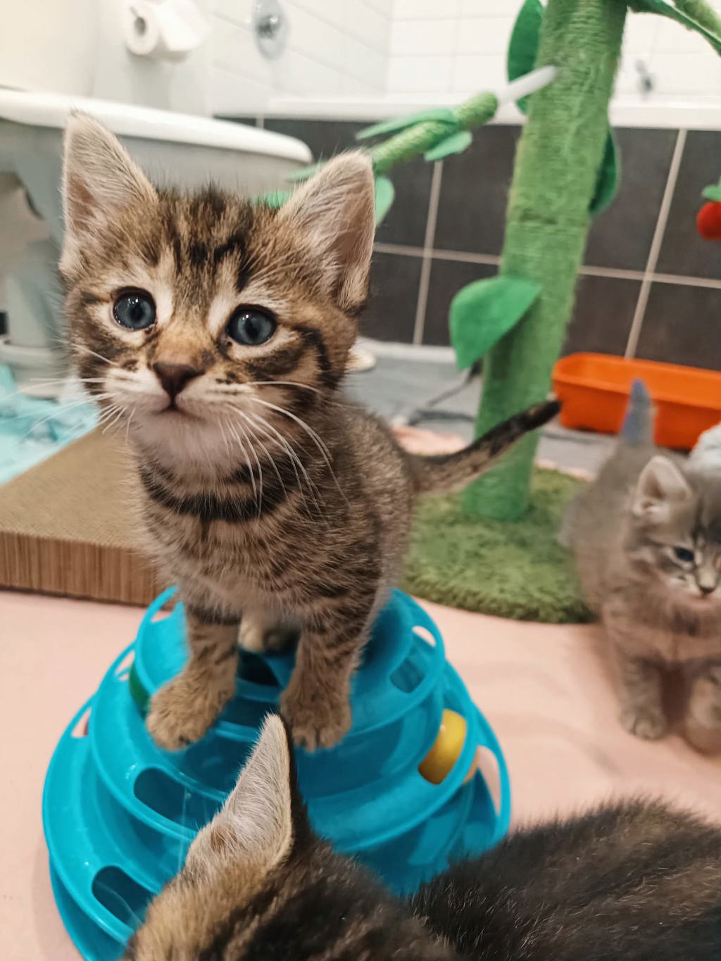 Bitsy is a gentle and affectionate kitten who enjoys playing just as much as she loves being close to her favorite humans. She's playful without being overly energetic and is content with chasing a toy or simply curling up beside you for some quiet time. Bitsy is known for her sweet, loving nature and will happily shower you with affection once she feels comfortable. She'd do well in a home where she can get a mix of play and cuddles, making her the perfect companion for anyone looking for a calm but playful kitten.