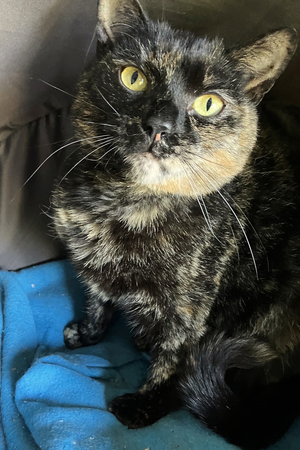 Beautiful tortie, Peggy, is about two years old.
