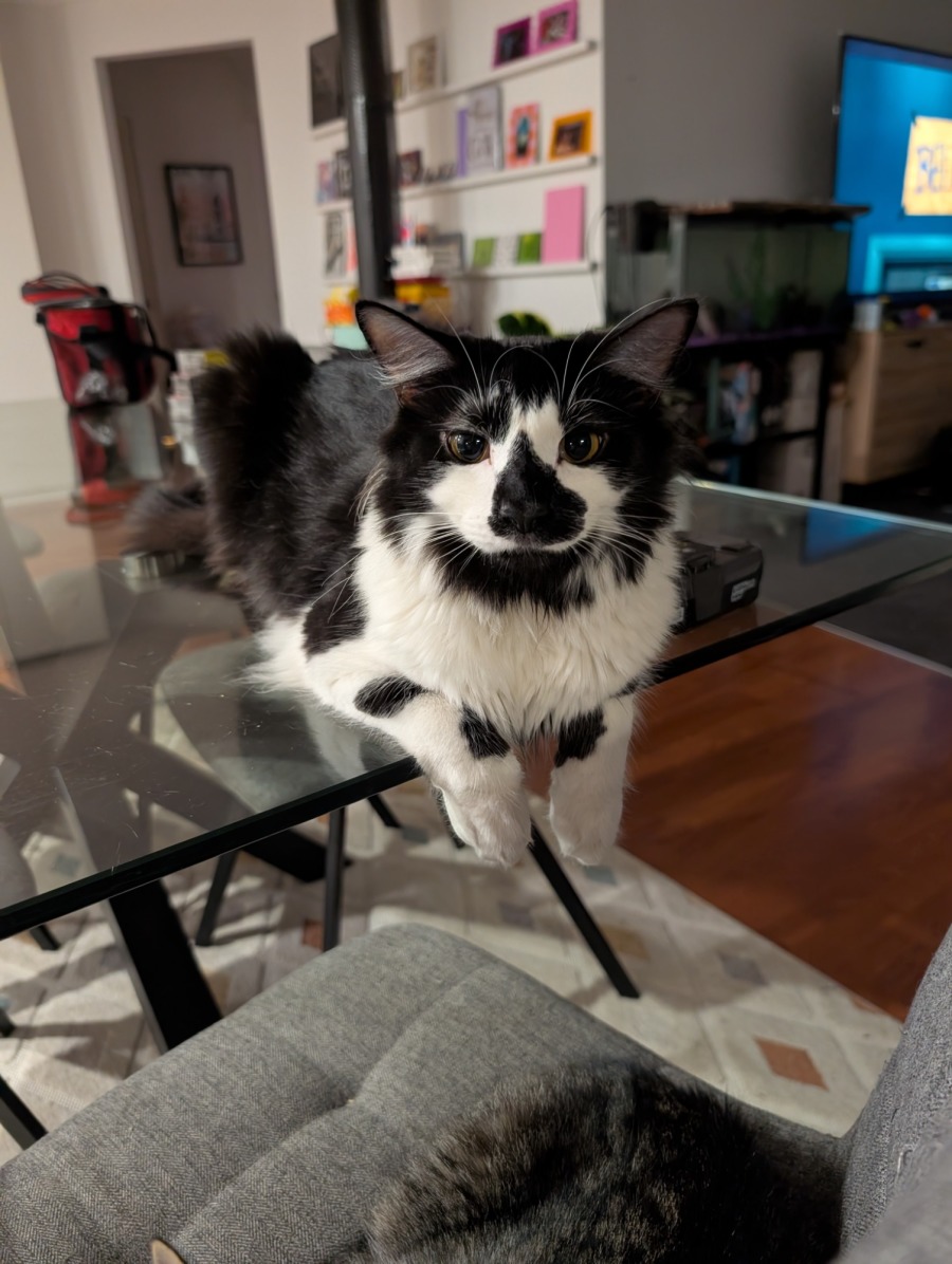 He enjoys the company of other cats, but only on his own terms, and spends much of his day in his beloved catio. Rain, hail, or shine, you’ll find him perched up high, the ultimate stickybeak, keeping watch over the neighbourhood. When he’s not people-watching, he’s likely curled up for a nap in the tallest cat tree or the highest, coziest corner of the catio.