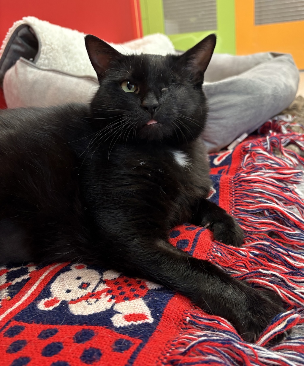 Iris is about 2 years old and came into our care with an eye injury. We're not sure if she was born with this issue or if she was injured but the eye needed to be removed. She has spent time out on foster watching cat TV and being spoilt rotten. Iris came back in after her stitches were removed and was paired up with Lexi who also came from the same property. The reunion was so beautiful, Lexi was so so happy to see Iris and Iris was happy to have her cone of shame off and to let Lexi give her a good wash. Now Ms Iris is a little bit on the chonky side so she will need a home where she can get some exercise that doesn't involve walking to the fridge. These two need to go home together as they just adore each other. If you'd like to meet Iris and Lexi we're open 7 days a week from 11.30am to 3.30pm.