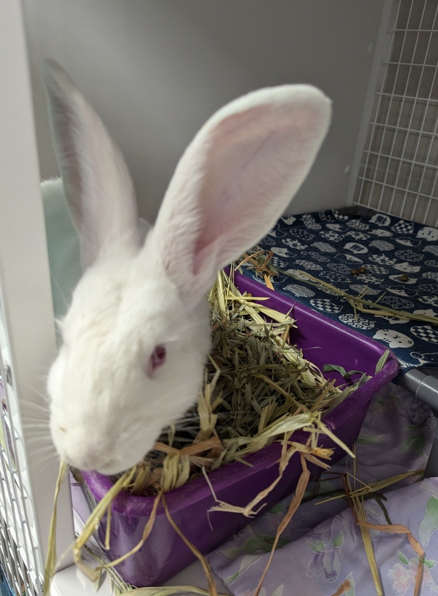 Meet Wallace, the young bunny with the most spectacular ears! Judging by his striking appearance, Wallace is likely a New Zealand White cross, which means he’s destined to grow into a big, beautiful bun.