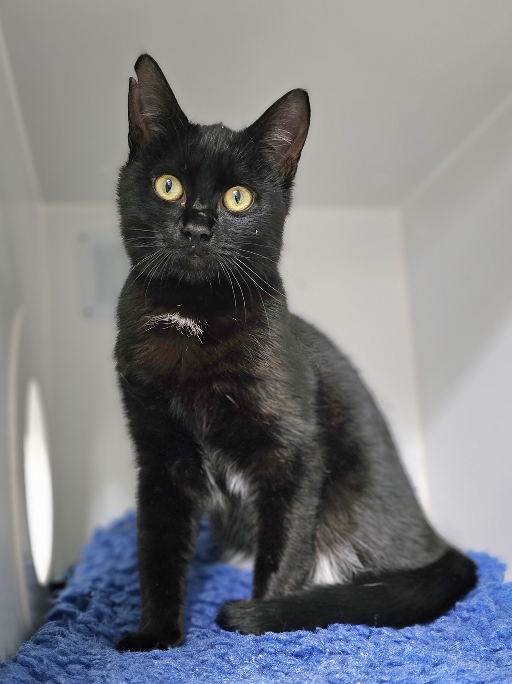Barry is a 1-year-old black cat with a calm, independent personality, but he can also be quite timid at times. He enjoys lounging in cozy spots and watching the world around him, and while he's shy initially, he warms up to people once he feels comfortable. Barry will need to go to a home with another confident cat to help him build confidence and feel secure. He's a quiet, affectionate companion who enjoys occasional cuddles, but he thrives in a calm, quiet environment. Barry would do best with someone patient who understands his need for a slow introduction and quiet companionship. If you're looking for a sweet, gentle cat with a bit of shyness to charm you, Barry could be the perfect match!